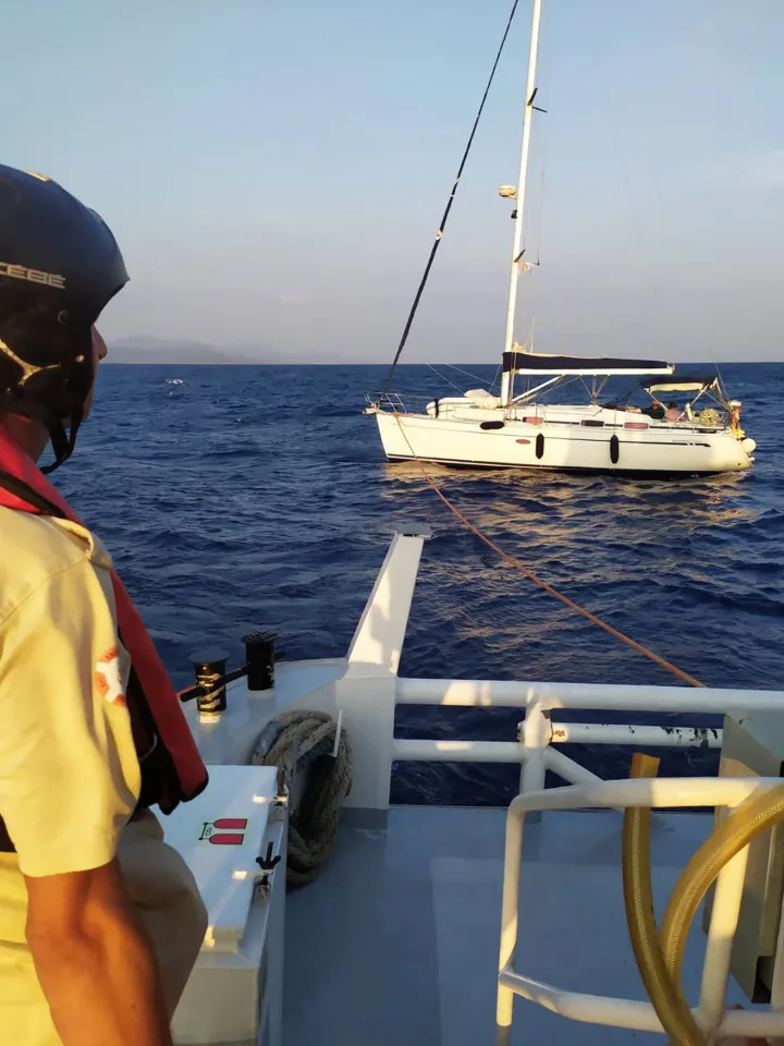 İçerisinde 2 kişi bulunan 14 metrelik tekne, kurtarma botuyla çekilerek Bodrum Limanı'na getirildi ve burada demir attı.
