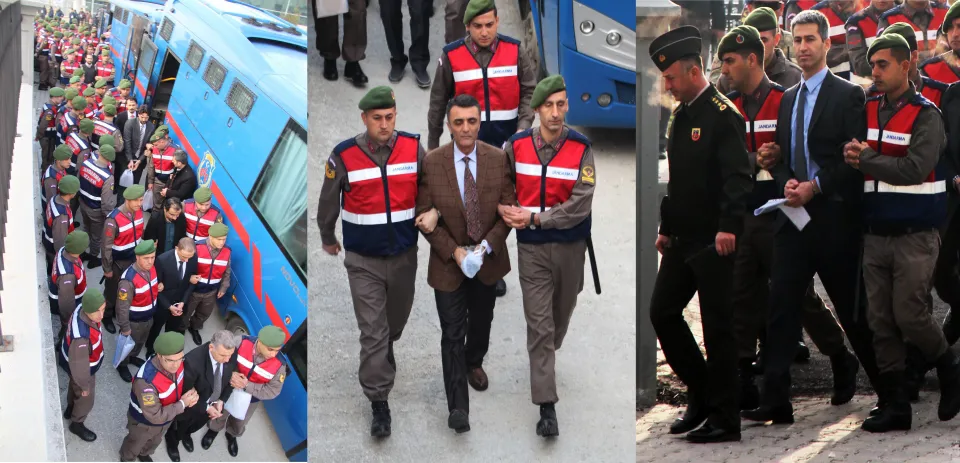 Muğla E Tipi Kapalı Cezaevinde kalan 44 tutuklu sanık sabah erken saatlerde jandarma ekipleri tarafından duruşma salonuna havadan helikopter destekli geniş güvenlik önlemleri altında getirilirken, sanıklar araçlarla direk duruşmanın yapılacağı salonun altındaki kapalı otoparka getirildi.(İHA)