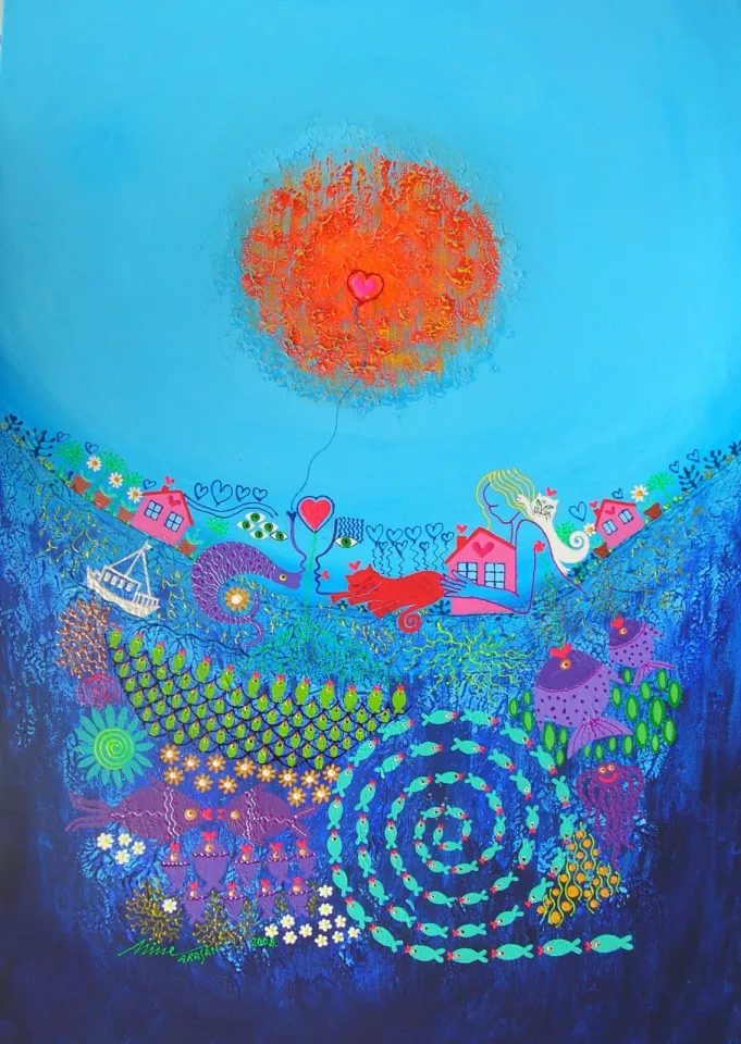 Duygularını renkler, balık, kedi, güneş ve deniz desenleri ile dışa yansıtan Mine Arasan çok çalışan ve çok üreten bir sanatçı. Bedri Rahmi Eyüboğlu’nun öğrencisi olan sanatçı Eyüboğlu gibi taş, tahta ve cam gibi birçok objeyi üzerine işlediği kendine özgü renkler ve desenler ile muhteşem eserlere dönüştürüyor.