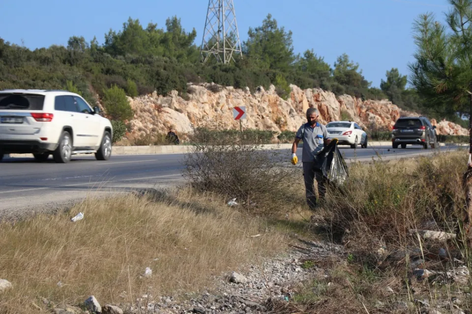 Belirtilen bölgede aralıklarla bırakılan Belediye Temizlik İşleri Müdürlüğüne bağlı temizlik görevlileri, seyir halindeki araçlardan atılan içecek kutuları, cam şişeler, maskeler, plastik ve kağıt atıklardan oluşan çöpleri tek tek topladı.
