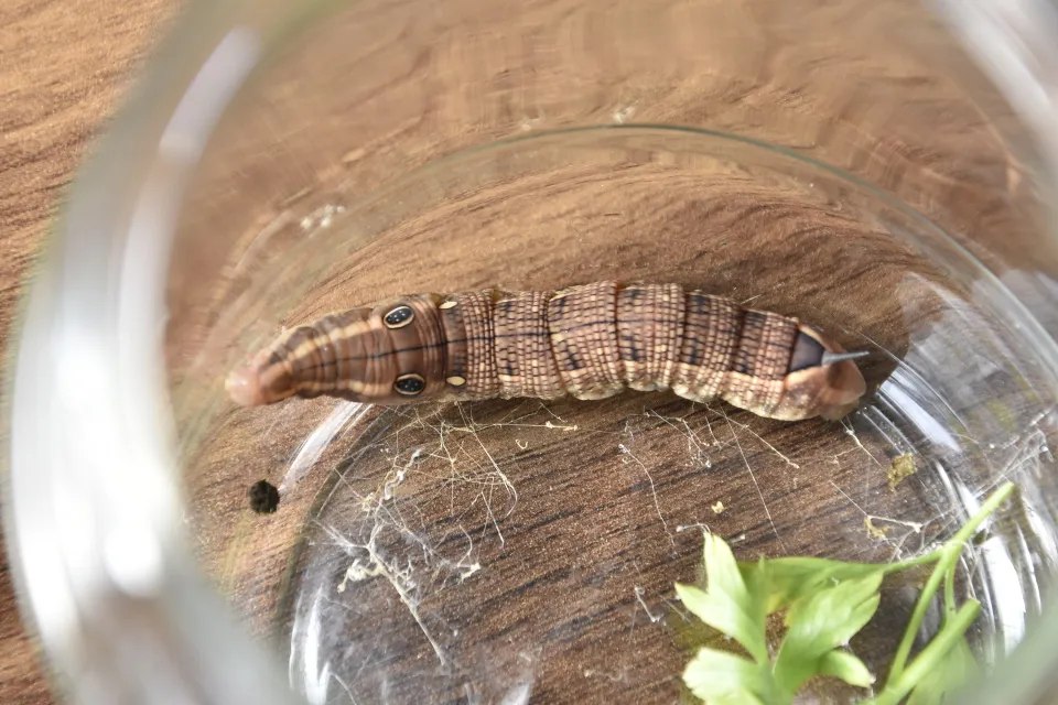 Ayşe Gündoğan, AA muhabirine, çocuklarına göstermek için kavanoza koyduğu tırtılın, yaptığı araştırmada "fil şahin güvesi larvası" olduğunu, ender bulunduğunu öğrendiklerini söyledi.