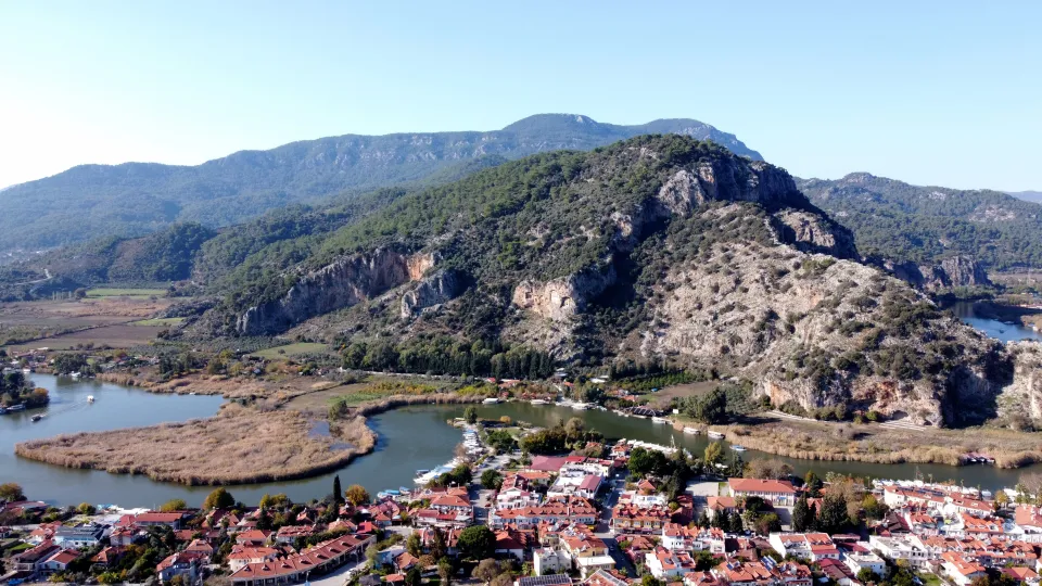 Ortaca ilçesinde havadan bakılınca deniz kaplumbağasına benzetilen dağın görüntüsü, sosyal medya kullanıcılarının beğenisini topladı.
