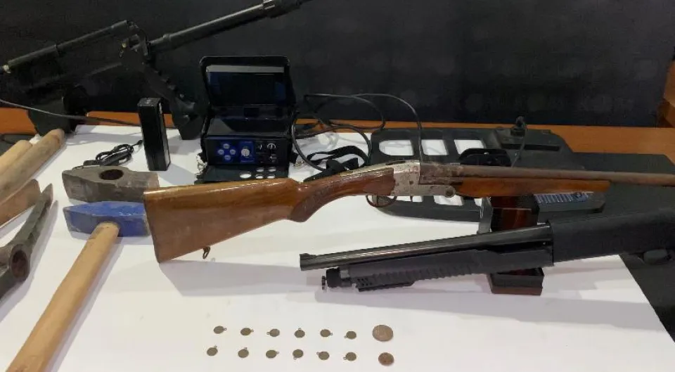 Adreslerdeki aramalarda, define arama dedektörü, 15 tarihi sikke, 4 parça halinde tarihi obje, 2 ruhsatsız tüfek ve kazıda kullanılan birçok araç gereç ele geçirildi.