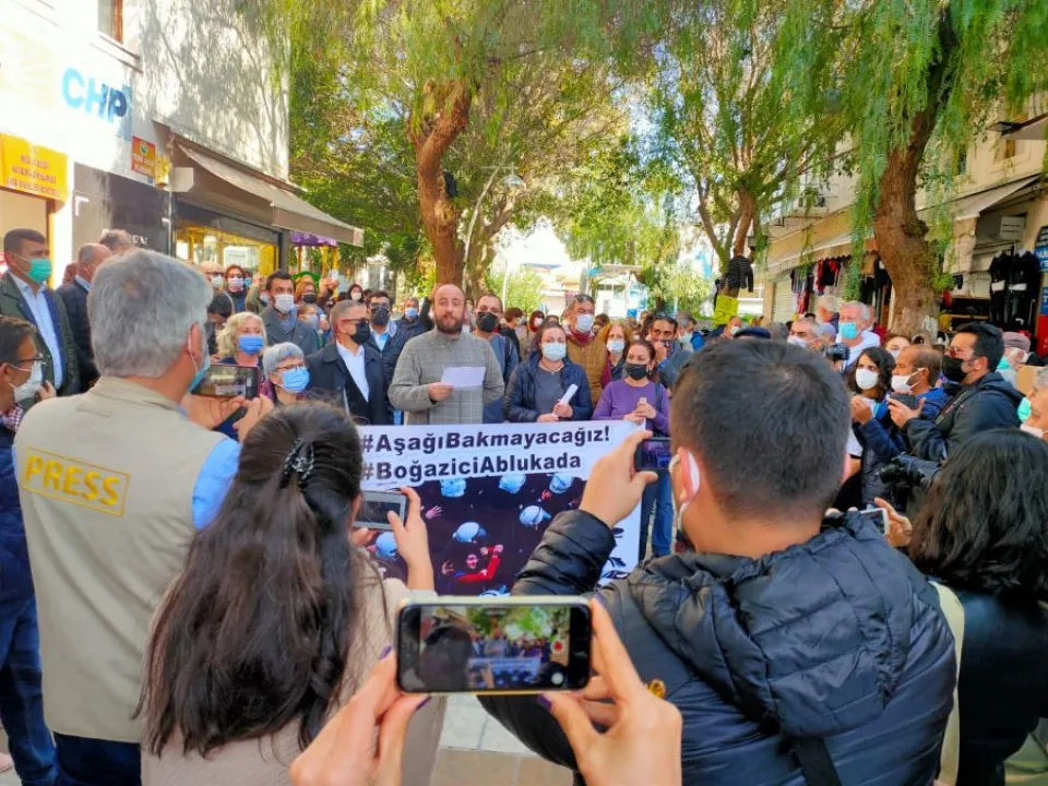 Muğla’nın Bodrum ilçesinde Boğaziçi Üniversitesinde yaşanan gelişmelere karşı basın açıklaması yapmak ve öğrencilere destek vermek için bir araya gelen topluluğa polis müdahale etti. Aralarında Cumhuriyet Halk Partisi Bodrum İlçe Başkanı Halil Karahan’ın da bulunduğu gruba gerçekleştirilen müdahaleye karşı, sloganlarla cevap verildi. Polisin tüm engellemelerine rağmen basın açıklaması gerçekleştirildi.