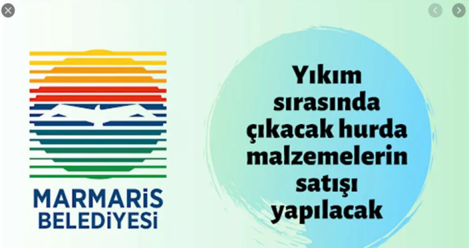 Marmaris Belediyesi’ne ait yıkım sırasında içinden çıkacak hurda malzemelerin 2886 sayılı Devlet İhale Kanununun 45. maddesi gereğince Açık Teklif Usulü ile satışı işi ihale edilecek.