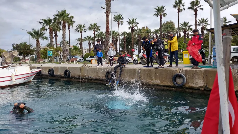 Dalgıçların katılımıyla yaklaşık bir saat süren temizlik sırasında deniz dibinden, otomobil lastiği, plastik, cam ve metal olmak üzere yarım tona yakın atık çıkarıldı.