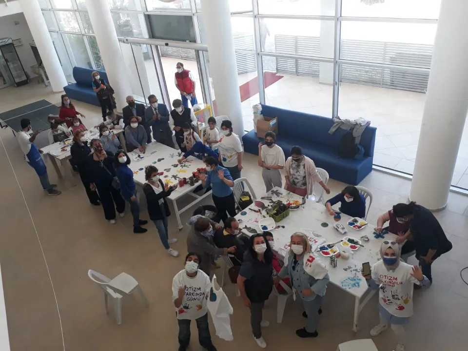 Otizm için farkındalık oluşturmak isteyen öğrenciler, otizmin simgesi olan el izi ve puzzle desenlerinden tişört boyayıp, afiş yaptılar. Öğrenciler, boyadıkları tişörtler etrafında toplu fotoğraf çektirdi.