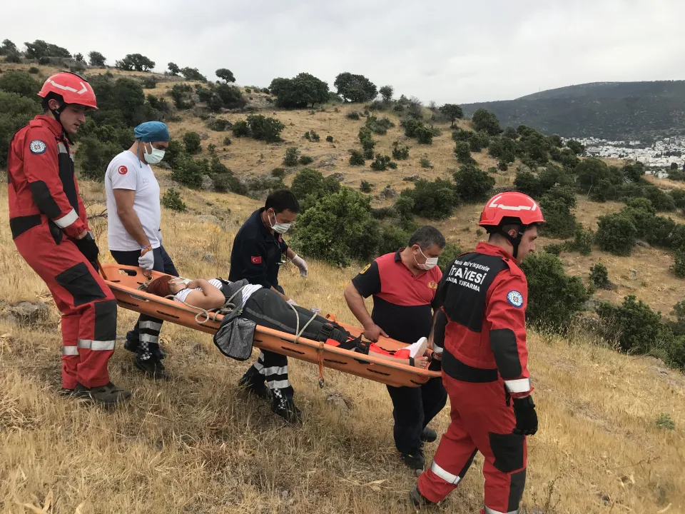 Bodrum ilçesinde çıktığı doğa yürüyüşünde dengesini kaybedip düşen kadın, itfaiye ve sağlık ekiplerinin bir saatlik çalışmasıyla kurtarıldı.
